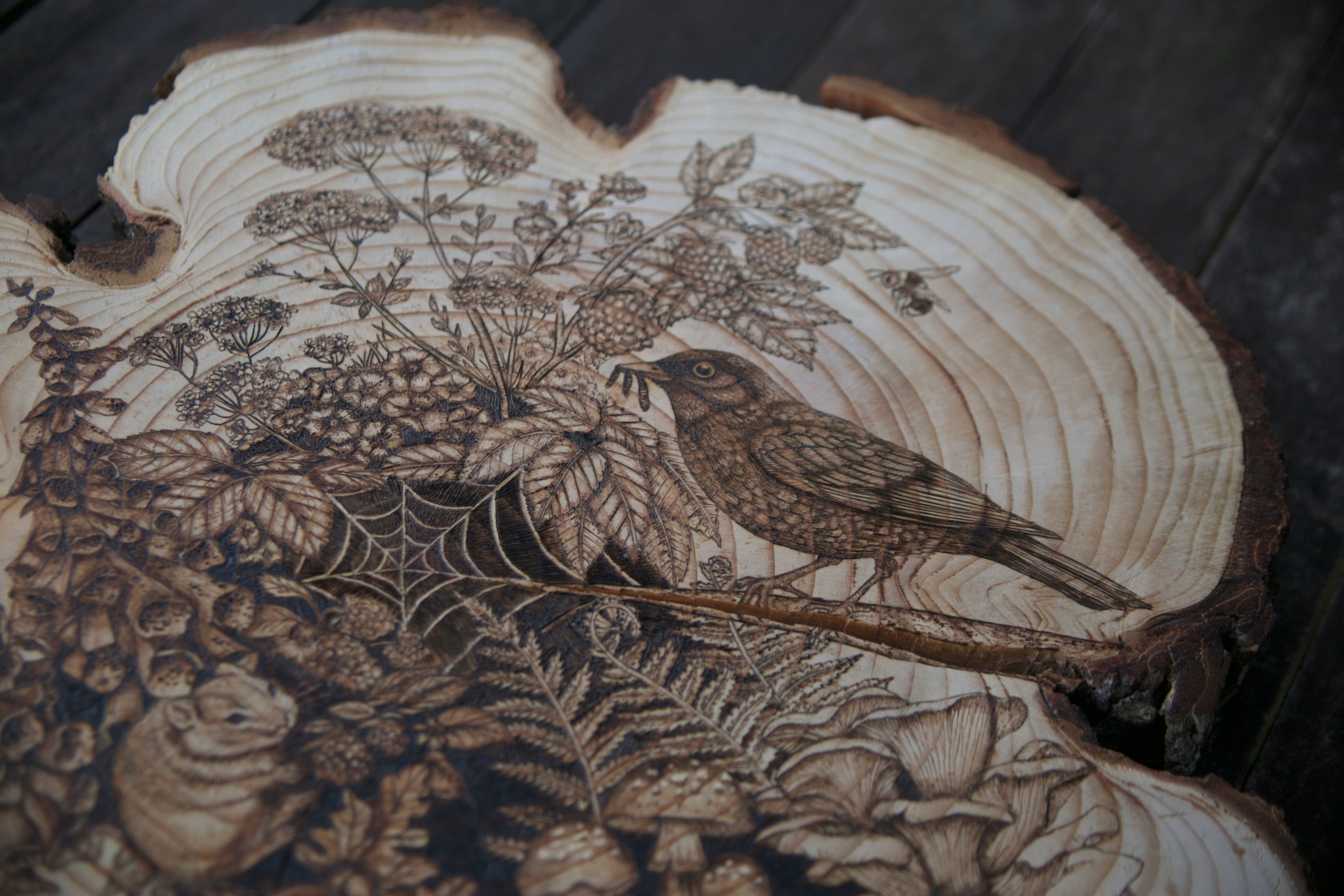 The original pieces at Sophie Mac Studio celebrate the quiet beauty of the natural world. Each artwork is individually hand-burned onto wood, capturing intricate details inspired by British fauna and flora — from wildlife and woodland creatures to delicate leaves, wildflowers, and organic textures.